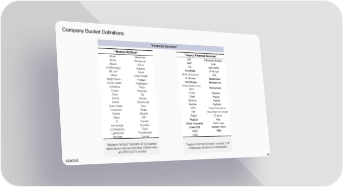 ACI Interactive Brokers ADP Intuit Jack Henry AssetMark LPL C. Schwab MasterCard Cantaloupe MeridianLink MoneyGram Paychex Cielo Paycor Euronet PayPal Evertec PaySafe EVO FIS Fiserv FleetCor Visa Global Payments Green Dot Western Union WEX