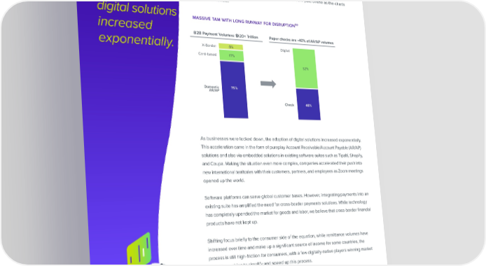 As businesses There has been an equal amount of innovation on the B2B side of the payments house. Due to stay at home order during the pandemic, businesses were forced to adapt to a work- were locked from-home environment with increasingly global payment participants almost overnight. Regardless of whether you are an SMB, mid-market, or enterprise business, an inordinate down, the amount of time is spent on accounts payable and invoices. Prior to COVID-19, there were full back-o昀케ce teams processing invoices, 50% of which were paid o昀툀ine as the charts adoption of below demonstrate. digital solutions massive tam with long runway for disruption50 increased B2B Payment Volumes: $120+ Trillion Paper checks are 40% of AR/AP volumes ~ exponentially. X-Border 8% Digital Card-based 17% 52% Domestic 75% AR/AP Check 48% As businesses were locked down, the adoption of digital solutions increased exponentially. This acceleration came in the form of pureplay Account Receivable/Account Payable (AR/AP) solutions and also via embedded solutions in existing software suites such as Tipalti, Shopify, and Coupa. Making the situation even more complex, companies accelerated their push into new international territories with their customers, partners, and employees as Zoom meetings opened up the world. Software platforms can serve global customer bases. However, integrating payments into an existing suite has ampli昀椀ed the need for cross-border payments solutions. While technology has completely upended the market for goods and labor, we believe that cross-border 昀椀nancial products have not kept up. Shifting focus brie昀氀y to the consumer side of the equation, while remittance volumes have increased over time and make up a signi昀椀cant source of income for some countries, the process is still high-friction for consumers, with a few digitally-native players winning market share by seeking to simplify and speed up this process. DIGITAL PAYMENT ACCELERATION SHARE VISIT PG 34