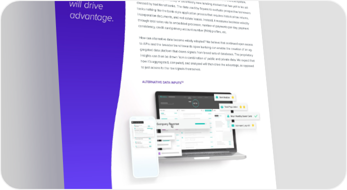 How it’s One of the most illustrative examples of the application of alternative data is Square aggregated, Capital now Square Financial Services (SFS), the SMB lending operations of FinTech player Square. SFS lends to businesses that were previously considered too risky or small, computed o昀昀ering loans as little as $500. As a result, the impact of micro-credit changes the growth trajectories for businesses that had previously been locked out of the 昀椀nancial system. and analyzed This opens up the possibility of an entirely new lending market that has yet to be ad- dressed by traditional banks. The data used by Square to evaluate prospective borrowers will drive looks nothing like the bank-style application process that requires historical tax returns, incorporation documents, and real estate leases. Instead, it measures business velocity advantage. through total sales via its embedded processor, number of payments per day, payment consistency, credit card primary account number (PAN) pro昀椀les, etc. How can alternative data become widely adopted? We believe that continued open access to APIs and the broader trend towards open banking can enable the creation of an ag- gregated data platform that draws signals from broad sets of databases. The proprietary insights can then be drawn from a combination of public and private data. We expect that how it’s aggregated, computed, and analyzed will then drive the advantage, as opposed to just access to the raw signals themselves. alternative data inputs32 ALTERNATIVE DATA PROVIDES A FRESH VIEW INTO FINANCIAL HEALTH SHARE VISIT PG 22