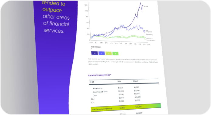payments companies continue to outperform other banking Even prior to sectors in value creation42 1 the pandemic, TRS performance of public companies Indexed to 100=January 2009 payments 1,600 businesses 1,400 Payments tended to 1,200 outpace 1,000 other areas 800 600 of 昀椀nancial Asset 400 management services. Retail banking 200 Corporate and investment banking 0 2009 2010 2011 2012 2013 2014 2015 2016 2017 2018 2019 2020 2021 CAGR 2009-2021 % 25 2 4 13 Note: Based on an analysis of public companies; custom indices (market-cap weighted) based on identied public European peers: payments N=27, retail banking N=20, asset management N=17, corporate banking N=5; 2019 data as of October; TRS CAGR for Jan 2009-July 2020 payments market size43 In $B USA Global E-commerce $1,000 $4,000 Card-Present Retail $3,000 $17,000 Cash $1,000 $9,000 C2B $5,000 $30,000 C2C $1,000 $2,000 Total Consumer Payments $5,000 $32,000 Digital $9,000 $62,000 O昀툀ine $16,000 $58,000 Total Business Payments $25,000 $120,000 DIGITAL PAYMENT ACCELERATION SHARE VISIT PG 30