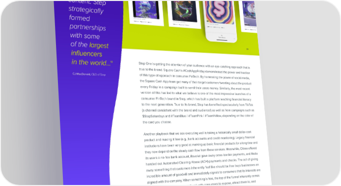 We wanted to tell our story and build through aspirational content. Step strategically formed partnerships with some of the largest 20 in昀氀uencers 19 Step One is getting the attention of your audience with an eye-catching approach that is in the world... true to the brand. Square Cash’s #CashAppFriday demonstrated the power and traction CJ MacDonald, CEO of Step of this type of approach in consumer FinTech. By harnessing the power of social media, the Square Cash App team got many of their target customers tweeting about the product every Friday in a campaign built to send their users money. Similarly, the most recent version of this has led to what we believe is one of the most impressive launches of a consumer FinTech brand in Step, which has built a platform teaching 昀椀nancial literacy to the next generation. True to its brand, Step has bene昀椀ted spectacularly from TikTok (a channel consistent with the brand and audience!) as well as from campaigns such as $StepSaturdays and #TeamBlue / #TeamPink / #TeamYellow, depending on the color of the card you choose. Another playbook that we see executing well is taking a historically small dollar-cost product and making it free (e.g., bank accounts and credit monitoring). Legacy 昀椀nancial institutions have been very good at marking up basic 昀椀nancial products for a long time and they now depend on the steady cash 昀氀ow from these services. Meanwhile, Chime o昀昀ered its users a no-fee bank account, Revolut gave away cross-border payments, and Melio handed out Automated Clearing House (ACH) payments and checks. The act of giving away something that customers inherently feel like should be free buys businesses an incredible amount of goodwill and immediately signals to consumers that its interests are aligned with the company. When something is free, the top of the funnel inherently comes easier and you position yourself well with consumers to expose, attract them to, and ultimately sell innovative 昀椀nancial products. Companies can use the free product as an acquisition wedge and monetize elsewhere in the value chain. START WITH CUSTOMER ACQUISITION SHARE VISIT PG 14