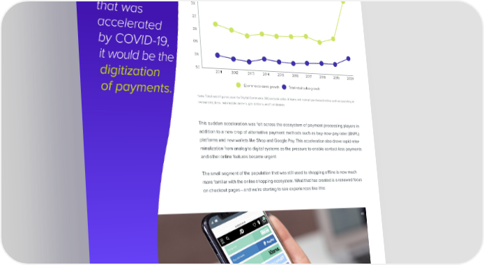 If we were comparing growth: u.s. ecommerce vs total retail sales44 Year-over-year growth, 2011-2020 forced to pick a single trend 35% within FinTech 30% 25% that was $20 accelerated %growth15% by COVID-19, 10% it would be the 5% digitization $0 2011 2012 2013 2014 2015 2016 2017 2018 2019 2020 of payments. Ecommerce sales growth Total retail sales growth Note: Total retail 昀椀gures used by Digital Commerce 360 exclude sales of items not normall purchased online such as spending at restaurants, bars, automobile dealers, gas stations, and fuel dealers This sudden acceleration was felt across the ecosystem of payment processing players in addition to a new crop of alternative payment methods such as buy-now-pay-later (BNPL) platforms and new wallets like Shop and Google Pay. This acceleration also drove rapid reter- minalization from analog to digital systems as the pressure to enable contact-less payments and other online features became urgent The small segment of the population that was still used to shopping o昀툀ine is now much more familiar with the online shopping ecosystem. What that has created is a renewed focus on checkout pages—and we’re starting to see experiences like this: 45 DIGITAL PAYMENT ACCELERATION SHARE VISIT PG 31