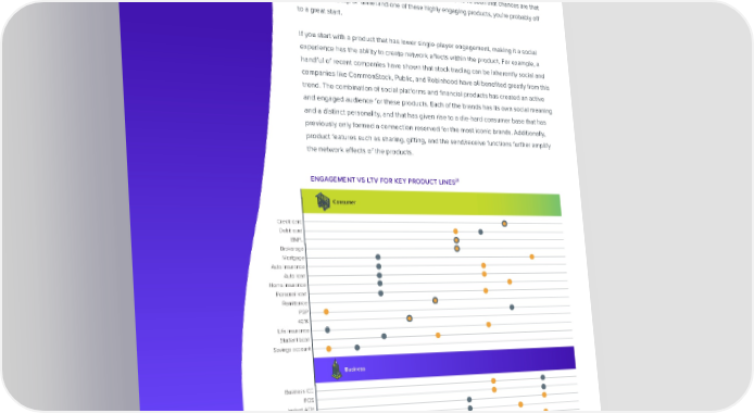 Once this top of funnel strategy is executed, we suggest turning to engagement. Without engagement (read: retention), the top of funnel e昀昀orts are wasted. Retention takes shape in a single 昀椀nancial product and/or by making money social. The reason everyone is launch- ing a debit and credit card right now is because they are such high-engagement (and LTV!) products. Similarly, peer to peer (P2P) payments are high engagement and social, but unfortunately historically have not monetized well. To date, we’ve seen that chances are that if you’ve nailed top of funnel and one of these highly engaging products, you’re probably o昀昀 to a great start. If you start with a product that has lower single-player engagement, making it a social experience has the ability to create network e昀昀ects within the product. For example, a handful of recent companies have shown that stock trading can be inherently social and companies like CommonStock, Public, and Robinhood have all bene昀椀ted greatly from this trend. The combination of social platforms and 昀椀nancial products has created an active and engaged audience for these products. Each of the brands has its own social meaning and a distinct personality, and that has given rise to a die-hard consumer base that has previously only formed a connection reserved for the most iconic brands. Additionally, product features such as sharing, gifting, and the send/receive functions further amplify the network e昀昀ects of the products. engagement vs ltv for key product lines21 Consumer Credit card Debit card BNPL Brokerage Mortgage Auto insurance Auto loan Home insurance Personal loan Remittance P2P 401K Life insurance Student Loan Savings account Business Business CC POS Instant ACH MCA Checkout/processing Payroll Billpay Business checking Business insurance Low 1 2 3 4 5 6 7 8 9 10High LTV Engagement START WITH CUSTOMER ACQUISITION SHARE VISIT PG 15