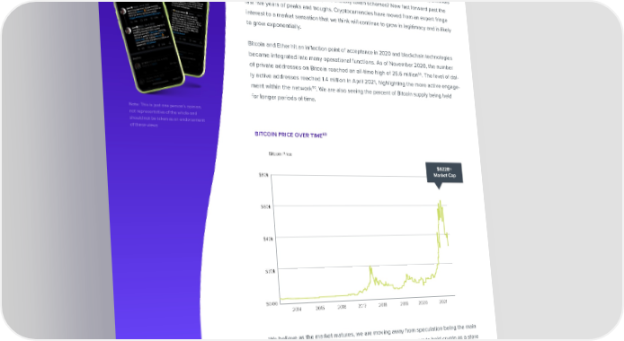 while some sound the alarm for a Cryptocurrency Advances to the Mainstream bubble, those deep in the space view crypto as an inevitability61 Remember all of those prior headlines focused on shady crypto mining operations, criminals pursuing nefarious transactions, and sketchy token schemes? Now fast forward past the last 昀椀ve years of peaks and troughs. Cryptocurrencies have moved from an expert fringe interest to a market sensation that we think will continue to grow in legitimacy and is likely to grow exponentially. Bitcoin and Ether hit an in昀氀ection point of acceptance in 2020 and blockchain technologies became integrated into many operational functions. As of November 2020, the number of private addresses on Bitcoin reached an all-time high of 25.6 million58. The level of dai- ly active addresses reached 1.4 million in April 2021, highlighting the more active engage- ment within the network59. We are also seeing the percent of Bitcoin supply being held for longer periods of time. Note: This is just one person’s opinion, not representative of the whole and should not be taken as an endorsement of these views bitcoin price over time60 Bitcoin Price $622B+ $80k Market Cap $60k $40k $20k $0.00 2014 2015 2016 2017 2018 2019 2020 2021 We believe as the market matures, we are moving away from speculation being the main driver of the market for consumers. Apps that enable consumers to hold crypto as a store of value are becoming so sophisticated that consumers can now buy crypto with a quick credit card transaction. Moreover, stablecoin wallets are in demand not only with consumers, but with institutions as well. CRYPTOCURRENCY ADVANCES TO THE MAINSTREAM SHARE VISIT PG 40