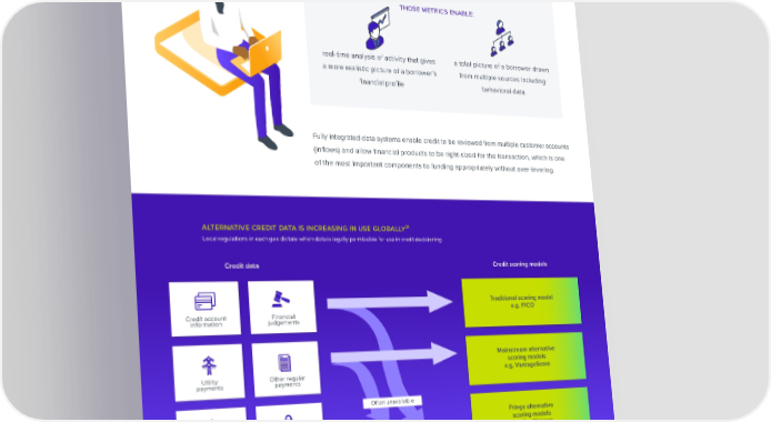New data sources enable an entirely new risk system based on metrics that have di昀昀erent characteristics than a typical FICO-based analysis, which fails to factor in key 30 indicators such as bank account balance, income, and salary . those metrics enable: real-time analysis of activity that gives a total picture of a borrower drawn a more realistic picture of a borrower’s from multiple sources including 昀椀nancial pro昀椀le behavioral data. Fully integrated data systems enable credit to be reviewed from multiple customer accounts (in昀氀ows) and allow 昀椀nancial products to be right-sized for the transaction, which is one of the most important components to funding appropriately without over-levering. alternative credit data is increasing in use globally31 Local regulations in each geo dictate which data is legally permissible for use in credit decisioning Credit data Credit scoring models Traditional scoring model Credit account Financial e.g. FICO information judgements Mainstream alternative scoring models Utility Other regular e.g. VantageScore payments payments Often unavailable Fringe alternative scoring models Government Shopping e.g. ZestFinance records habits Social Location Web tracking media data ALTERNATIVE DATA PROVIDES A FRESH VIEW INTO FINANCIAL HEALTH SHARE VISIT PG 21