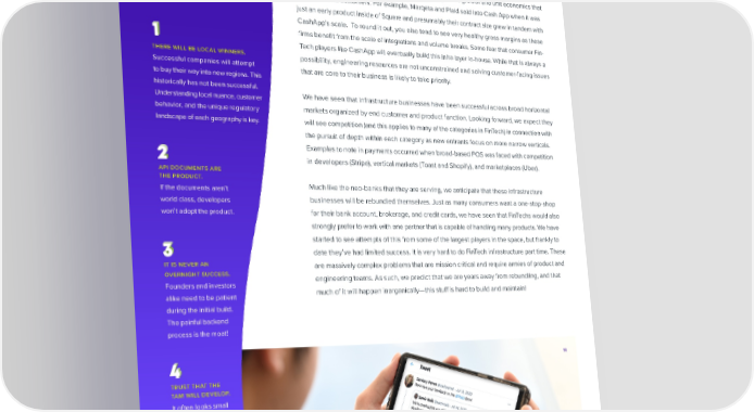 Customer relationships can be separated from banking infrastructure as the front-end first principles experience is controlled by an entity distinct from the one that owns the balance sheet or the banking licenses. As we think about the future of FinTech In addition to a signi昀椀cant and growing TAM, we think that FinTech infrastructure can be a infrastructure, there are several key great business model that lends itself well to developer-led growth and unit economics that principles that guide our belief in the success of the business. For example, scale with end customers. For example, Marqeta and Plaid sold into Cash App when it was we expect: just an early product inside of Square and presumably their contract size grew in tandem with CashApp’s scale. To round it out, you also tend to see very healthy gross margins as these 昀椀rms bene昀椀t from the scale of integrations and volume breaks. Some fear that consumer Fin- Tech players like CashApp will eventually build this infra layer in-house. While that is always a there will be local winners. possibility, engineering resources are not unconstrained and solving customer-facing issues Successful companies will attempt that are core to their business is likely to take priority. to buy their way into new regions. This historically has not been successful. We have seen that infrastructure businesses have been successful across broad horizontal Understanding local nuance, customer behavior, and the unique regulatory markets organized by end customer and product function. Looking forward, we expect they landscape of each geography is key. will see competition (and this applies to many of the categories in FinTech) in connection with the pursuit of depth within each category as new entrants focus on more narrow verticals. Examples to note in payments occurred when broad-based POS was faced with competition in developers (Stripe), vertical markets (Toast and Shopify), and marketplaces (Uber). api documents are the product. If the documents aren’t Much like the neo-banks that they are serving, we anticipate that these infrastructure world class, developers businesses will be rebundled themselves. Just as many consumers want a one-stop-shop won’t adopt the product. for their bank account, brokerage, and credit cards, we have seen that FinTechs would also strongly prefer to work with one partner that is capable of handling many products. We have started to see attempts of this from some of the largest players in the space, but frankly to date they’ve had limited success. It is very hard to do FinTech infrastructure part time. These it is never an are massively complex problems that are mission critical and require armies of product and overnight success. engineering teams. As such, we predict that we are years away from rebundling, and that Founders and investors much of it will happen inorganically—this stu昀昀 is hard to build and maintain! alike need to be patient during the initial build. The painful backend process is the moat! 14 trust that the tam will develop. It often looks small in the beginning. INFRASTRUCTURE IS ENABLING INNOVATION SHARE VISIT PG 10