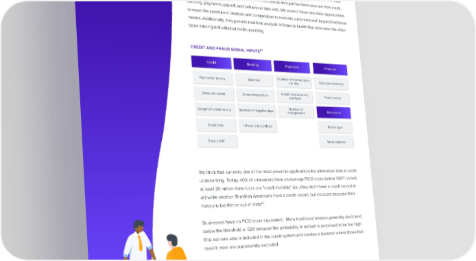 Alternative Data Provides a Fresh View Into Financial Health Throughout every phase of a customer journey, 昀椀nancial products use varied sources of data as a means to evaluate consumer health. That data as an input has been sourced from credit, banking, payments, payroll, and behavioral data sets. We expect these new data opportunities to open the aperture of analysis and computation to evaluate customers well beyond traditional means. Additionally, they provide real-time analysis of 昀椀nancial health that otherwise has often been missing in traditional credit reporting. credit and fraud signal inputs27 Credit Banking Payments Financial Payments history Balance Number of transactions Total loan balances per day Amounts owed Direct deposit link Credit card diversity Total income and type Length of credit history Number of negative days Number of Behavioral chargebacks Credit mix In昀氀ows and out昀氀ows Phone type New credit Email address We think that currently one of the most powerful applications for alternative data is credit 28. In fact, underwriting. Today, 40% of consumers have an average FICO score below 700 at least 26 million Americans are “credit invisible” (i.e., they don’t have a credit record at all) while another 19 million Americans have a credit record, but no score because their 29 history is too thin or out-of-date . Businesses have no FICO score equivalent. Many traditional lenders generally don’t lend below the threshold of 620 because the probability of default is perceived to be too high. This narrows who is included in the credit system and creates a dynamic where those that need it most are purposefully excluded. ALTERNATIVE DATA PROVIDES A FRESH VIEW INTO FINANCIAL HEALTH SHARE VISIT PG 20