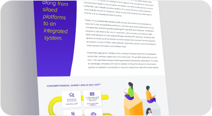 Critical data Today, we see many apps connecting into foundational financial systems that drive important components of the value chain such as insight and connectivity into both aggregation the consumer’s paycheck and bank account. We think these systems contain important logic to analyze identity as well as consumer ability and willingness to repay. Payroll will likely providers like ADP or Equifax are likely the 昀椀rst companies to know that a consumer lost their job. That data isn’t transported systematically to 昀椀nancial 昀椀les, which means other move us signals become dependent on seeing the direct deposit from your paycheck. We expect improved data infrastructure to broaden and deepen the links to data sources, so much along from so that this type of insight becomes ordinary. As a result, if it occurs, then customers could reap the bene昀椀t of companies’ ability to track and respond to key milestones in siloed their life and corresponding 昀椀nancial journey. platforms Finally, it’s our opinion that in today’s post-stimulus environment, the distribution of to an Cares Act funds, American Rescue Plan Act, and basic government entitlements such as unemployment would be greatly advantaged if data APIs were deployed. Entitlement integrated programs could identify the loss of a paycheck, verify accounts, and disburse right- sized funds all based on data sourced through real-time APIs. Moreover, we believe that system. speed and e昀케ciency of distribution could be dramatically improved from the long lines and system crashes of 2020, while synthetic monitoring systems could be leveraged to review account information and minimize fraud. Critical data aggregation will likely move us along from siloed platforms to an integrated system that combines signals from many data types. The possible applications are end- less—from sales forecasting and lead generation to promotional optimization. To create an advantage, companies will need to consider shifting their analysis to cloud-based systems to enable the combination of customer transactional data with external signals. 34 consumer financial journey: data at each step Student loan First teenage debit for university card for parental allowance Sallie Mae, SoFI Greenlight, Step, GoHenry First job out of college with payroll Car loan account, bank account Carvana, AutoFi Chase, Wells Fargo Wealth investment Home mortage Vanguard, M1 Rocket Mortage, Finance Better.com ALTERNATIVE DATA PROVIDES A FRESH VIEW INTO FINANCIAL HEALTH SHARE VISIT PG 24